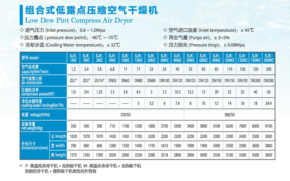 產(chǎn)品描述:組合式干燥機(jī)具有低露點,低壓降,再生氣量小的特點,并提供多種組合:高溫風(fēng)冷/水冷式冷干機(jī),無熱/微熱吸干機(jī),不銹鋼冷干機(jī)/吸干機(jī)等